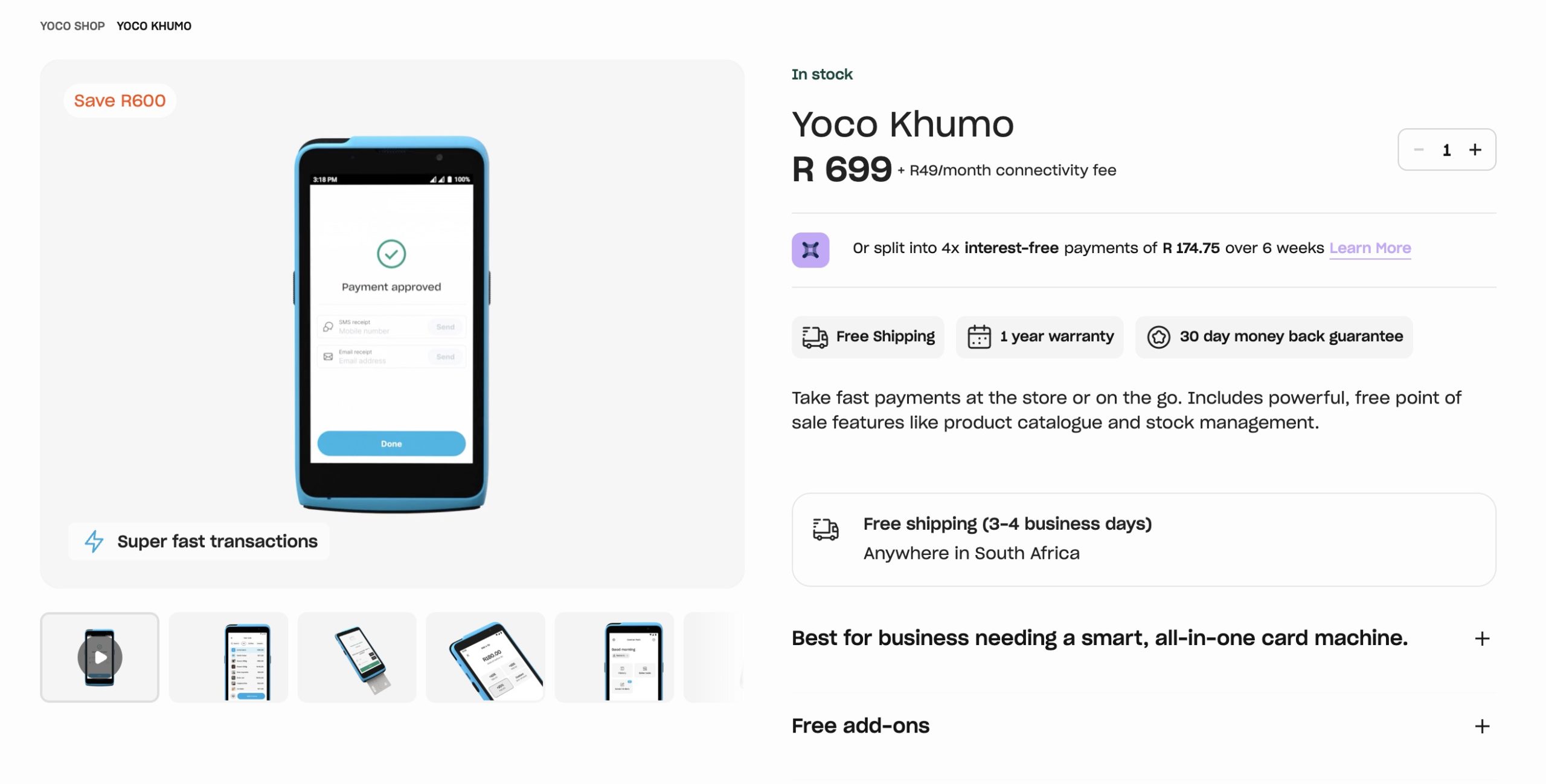 So, one potential downside is that the Yoco Khumo doesn’t pair with Yoco’s POS, as it’s a fully standalone device with its own custom software.